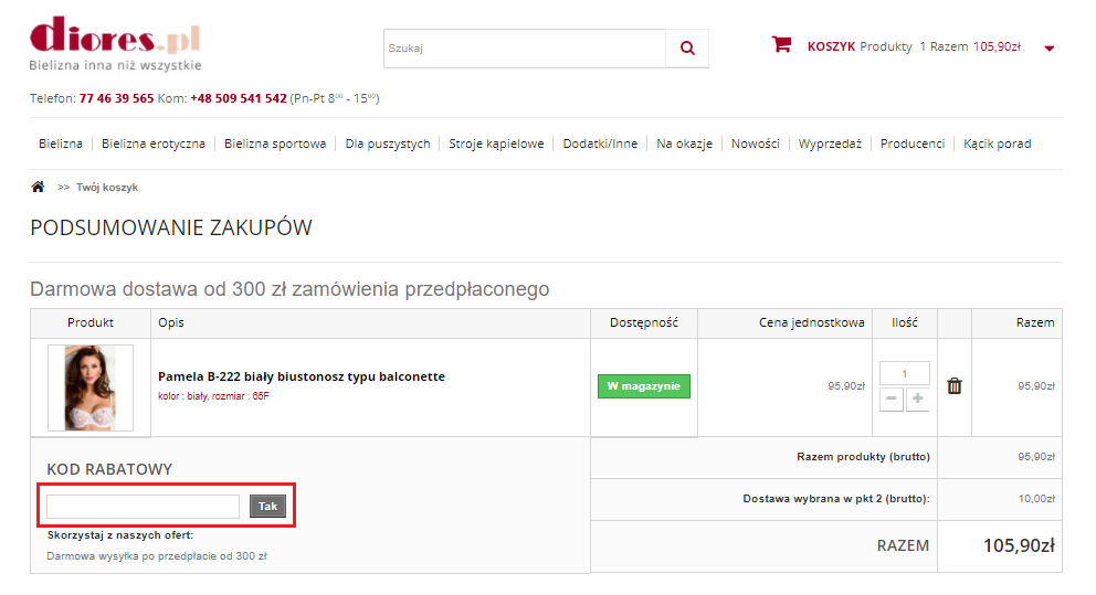 W Diores.pl znajdziesz bieliznę na każdą okazję – zarówno do noszenia na co dzień, jak i taką, która przyda się na wieczorne randki tylko we dwoje. Sklep oferuje wyłącznie produkty pochodzące od najlepszych marek polskich i zagranicznych – bieliznę tworzoną z delikatnych materiałów, utrzymaną w stylowych fasonach, które świetnie pasować będą do każdego typu figury. Kupując tutaj, masz pewność, że uzyskujesz dostęp do oryginalnych produktów, które pobudzą Twoje zmysły i pozwolą czerpać maksimum radości każdego dnia. Jeżeli zatem potrzebna Ci modna bielizna: biustonosz, koszulka nocna, stringi, gorset, rajstopy, seksowne pończochy, czy stylowy kostium kąpielowy - Diores.pl to miejsce idealne dla Ciebie. Dodatkowo, mając w ręku kod promocyjny do Diores.pl, możesz poddać się szałowi zakupów bez wyrzutów sumienia – wszystkie produkty kupisz bowiem w jeszcze lepszej cenie. Każdy kod rabatowy udostępniony w naszym serwisie jest zupełnie bezpłatny. Skorzystasz z niego podczas dokonywania zakupów online – bez względu na to, na którą metodę płatności się zdecydujesz. Cała procedura jest banalna – przepisujesz lub kopiujesz kod promocyjny obniżający wartość całego koszyka lub dający zniżkę na konkretny produkt podczas finalizowania zamówienia. Kilka kliknięć wystarczy, byś cieszył się najmodniejszą bielizną, nie przepłacając! Już teraz przejrzyj katalog bielizny Diores.pl i wybierz z niego to, co najbardziej Ci się podoba. A zaoszczędzone pieniądze odłóż na konto, lub (co jest lepszym pomysłem), wydaj na drugi biustonosz czy gorset!