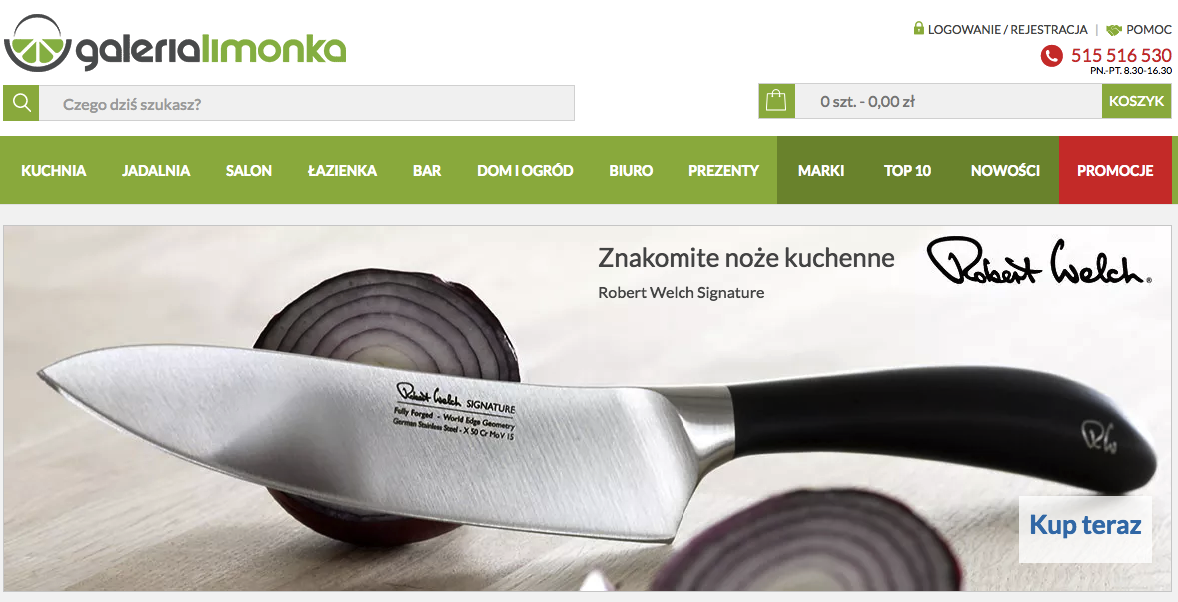 GaleriaLimonka.pl to sklep internetowy, którzy urzeknie cię szeroki wyborem asortymentu do twojego domu. Znajdziesz tutaj oryginalne i niebanalne akcesoria, dzięki którym odmienisz aranżację całego mieszkania. Oferta obejmuje praktyczne i designerskie gadżety do kuchni, jadalni, salonu, łazienki, baru czy ogrodu. Produkty podzielone na kategorie pozwalają na sprawne i satysfakcjonujące zakupy. GaleriaLimonka.pl to sklep, w którym nie ma miejsca na kompromis względem jakości. Oferowany asortyment pochodzi wyłącznie od renomowanych marek, wśród których wymienić można m.in. Vacu Vin, Stanley, Bodum, AdHoc, Chasseur, Jamie Oliver, Joseph Joseph, Karlsson, Olala, Pufa Desing i wiele innych. Systematycznie wprowadzane są nowe kolekcje, by każdy mógł stworzyć modne wnętrze o niepowtarzalnym charakterze. Designerskie akcesoria do domu wcale nie muszą być drogie. Kody rabatowe sprawiają, że GaleriaLimonka.pl ciągle oferuje produkty w obniżonych cenach. Nie musisz więc czekać na sezonowe wyprzedaże związane choćby z wietrzeniem magazynów z końcówek kolekcji. Mając kupony promocyjne, możesz kupować ze zniżkami przez cały rok. Niektóre kody rabatowe uprawniają do zniżek cenowych, a niektóre obejmują darmową przesyłkę. Bez względu na to, i tak możesz sporo zaoszczędzić. Już teraz pobierz aktualny kupon promocyjny, by cieszyć się nieograniczonymi zakupami.