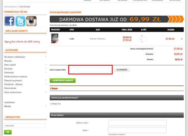 5. Umieść produkty w koszyku. Kod wpisz lub skopiuj i wklej w okienko: „Kod rabatowy”. Kliknij przycisk: „przelicz”. Zaloguj się lub podaj wymagane dane i złóż zamówienie.