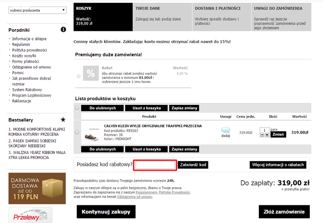 5. Umieść produkty w koszyku. Kod wpisz lub skopiuj i wklej w okienko: „Kod rabatowy”. Kliknij przycisk: „przelicz”. Zaloguj się lub podaj wymagane dane i złóż zamówienie.