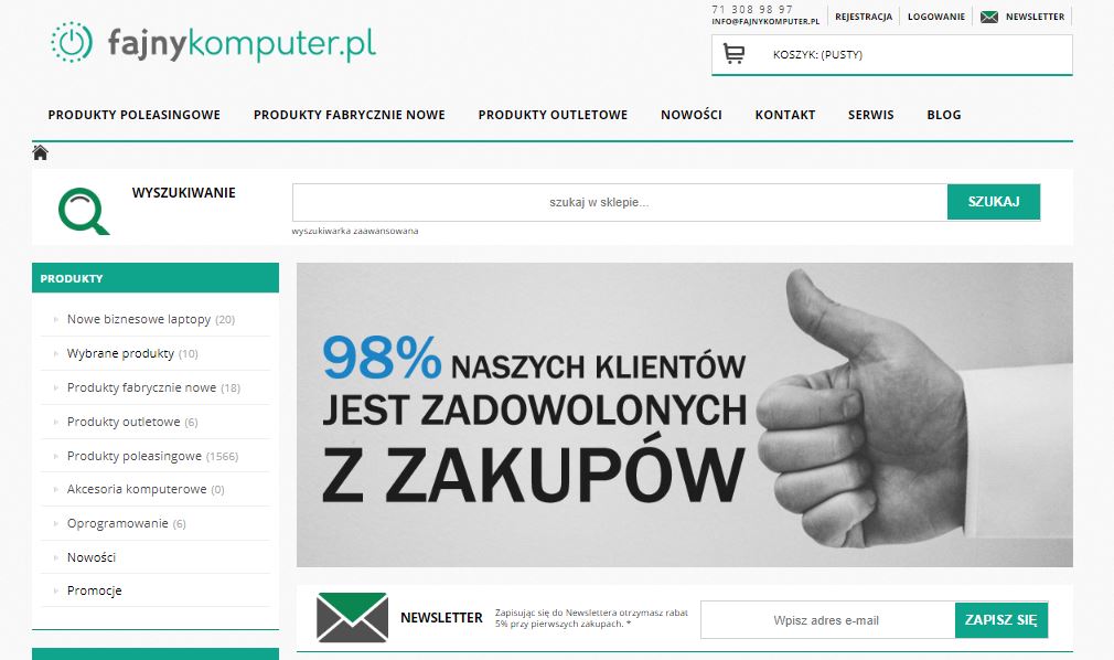 Fajnykomputer.pl jest sklepem internetowym skierowanym dla klienta biznesowego, a w ofercie znajduje się sprzęt komputerowy, zarówno nowy, jak i poleasingowy, przeznaczony dla bardziej wymagającego użytkownika. Klienci znajdą na stronie sklepu komputery klasy biznesowej, monitory, a także serwery.