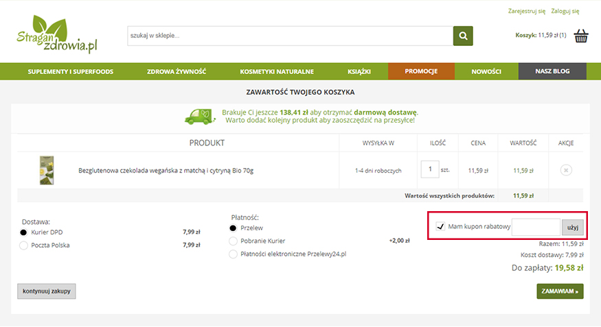 5. Umieść produkty w koszyku. Kod wpisz lub skopiuj i wklej w okienko: „Kod rabatowy”. Kliknij przycisk: „przelicz”. Zaloguj się lub podaj wymagane dane i złóż zamówienie.