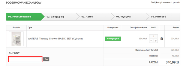 5. Należy wybrać produkt, a następnie postępować zgodnie z pojawiającymi się wskazówkami. Wyświetli się okienko: „Wprowadź kod rabatowy”, w które wpisujemy lub wklejamy otrzymany kod. Realizacja zamówienia może odbywać się na dwa sposoby: przez zalogowanie na stronie sklepu lub przez skorzystanie z opcji zakupów bez rejestracji.